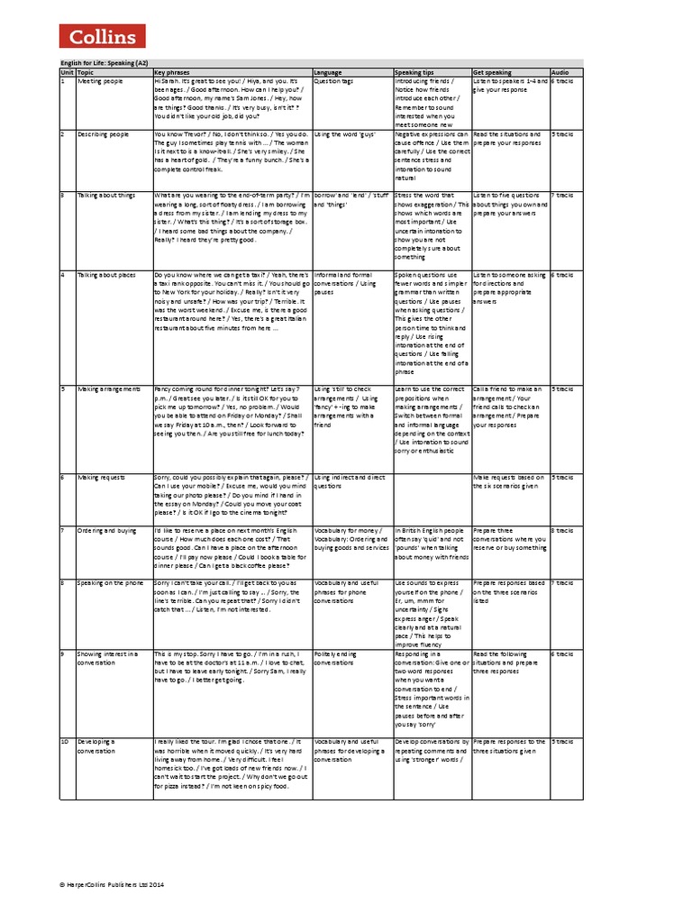 Unit Topic Key Phrases Language Speaking Tips Get Speaking Audio English For Life Speaking A2 Pdf Question Vocabulary